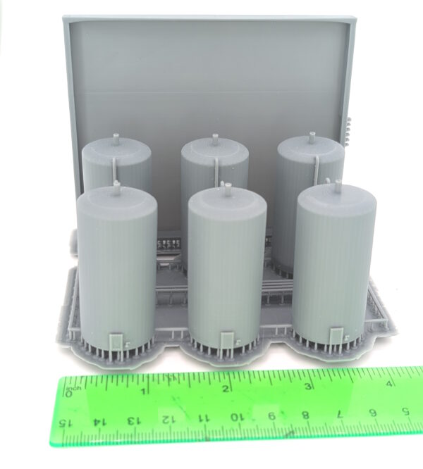These N-Scale Tank Battery are 3D resin printed, high detail models. But as resin is delicate, if they do break all you have to do is use thick super glue to put them together again – but I’m sure you already know that being an hobbiest like you are!